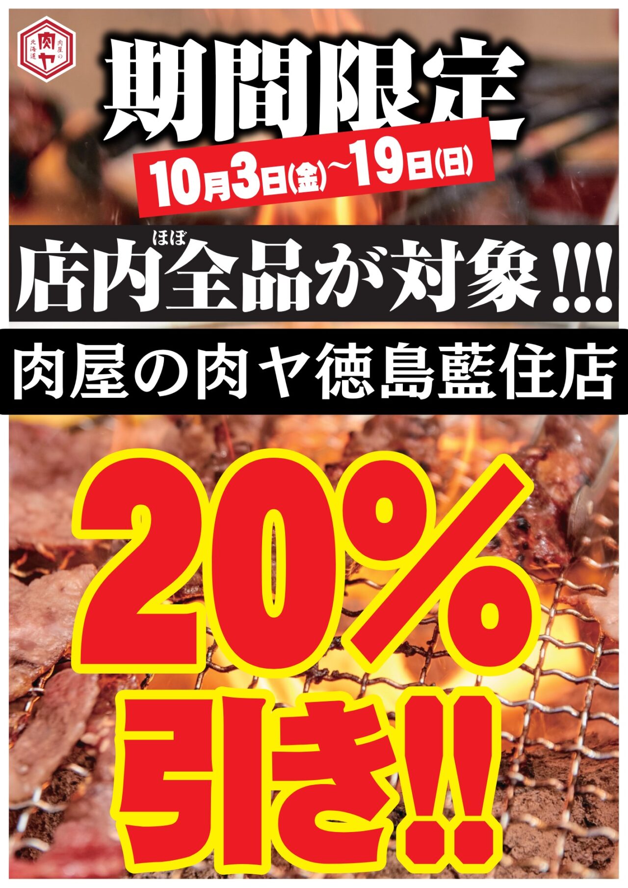 本日2025年10月3日(金)~19日(日)までの約一週間、徳島県板野郡藍住町にある「肉屋の肉ヤ 徳島藍住店」が店内ほぼ全品20%OFFキャンペーンを実施中です。