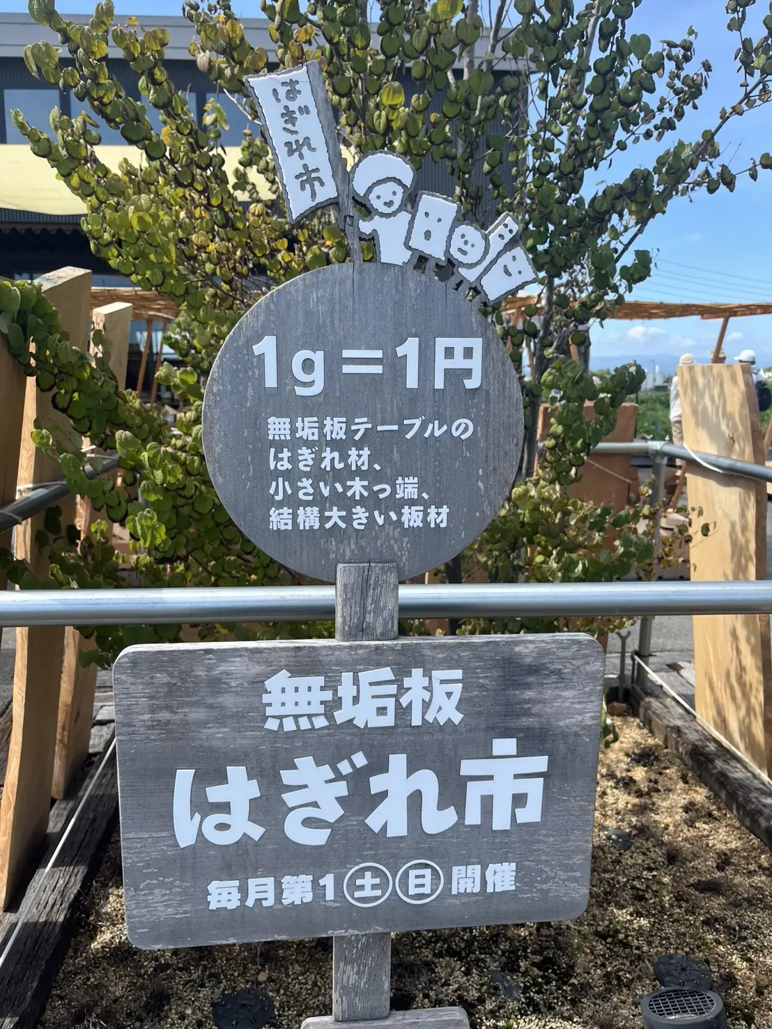 「はぎれ市」とは、毎月第一の土日に「テーブル工房kiki」の駐車場にて開催されていて、制作中に出る端切れや棚板の材料などを1g×1円で購入できるイベントです。