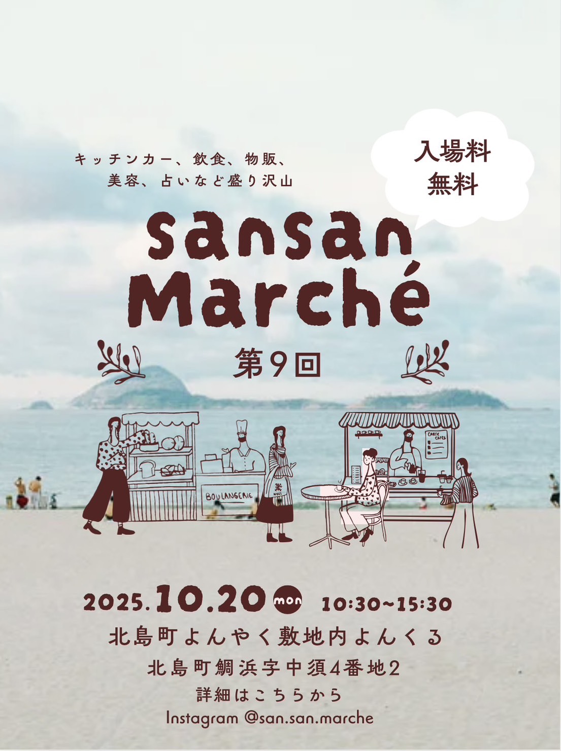 2025年10月20日(月)10:30~15:30まで、徳島県板野郡北島町にある「株式会社よんやく 徳島営業部」敷地内の「よんくる」にて第9回「sansan Marche」が開催予定です。