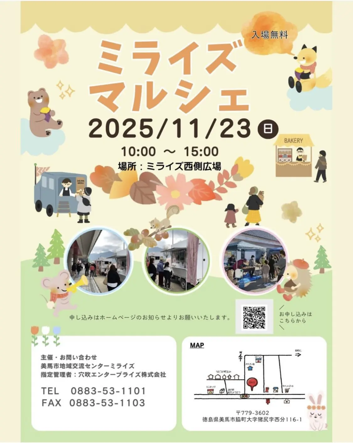 ぜひ皆様も、「ミライズ(美馬市地域交流センター)西側広場」にて明日11月23日(日)10:00~15:00に開催予定の「ミライズマルシェ」へ足を運んでみてくださいね。