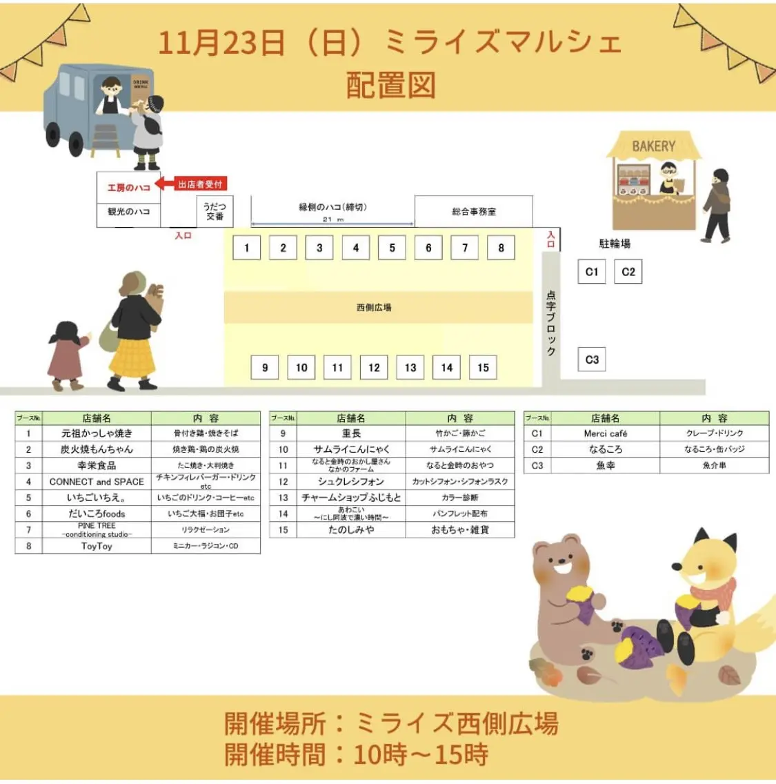 イベントでは以下「ミライズマルシェ配置図」のように、フード系をはじめ、ハンドメイドや雑貨、古着にリラクゼーションとバリエーション豊富な出店者が数多く集結予定。
