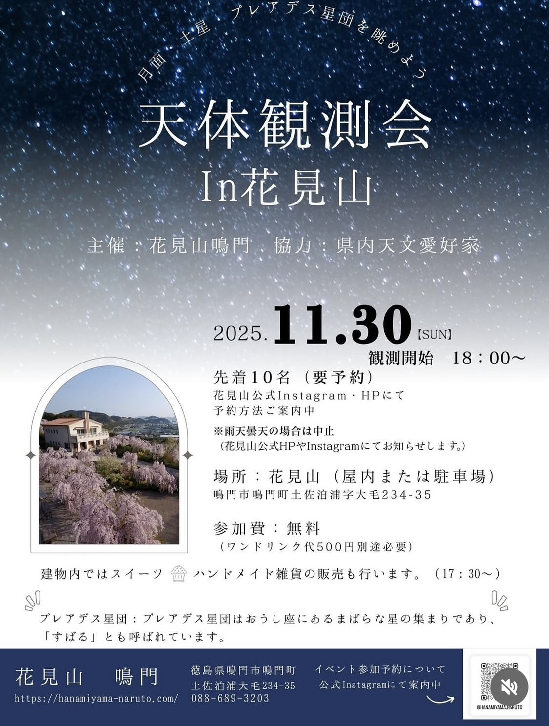 今週末2025年11月30日(日)、徳島県鳴門市鳴門町にある「花見山 鳴門」では18:00(※出店は17:30~より開始)より「天体観測会in花見山」が開催予定です。