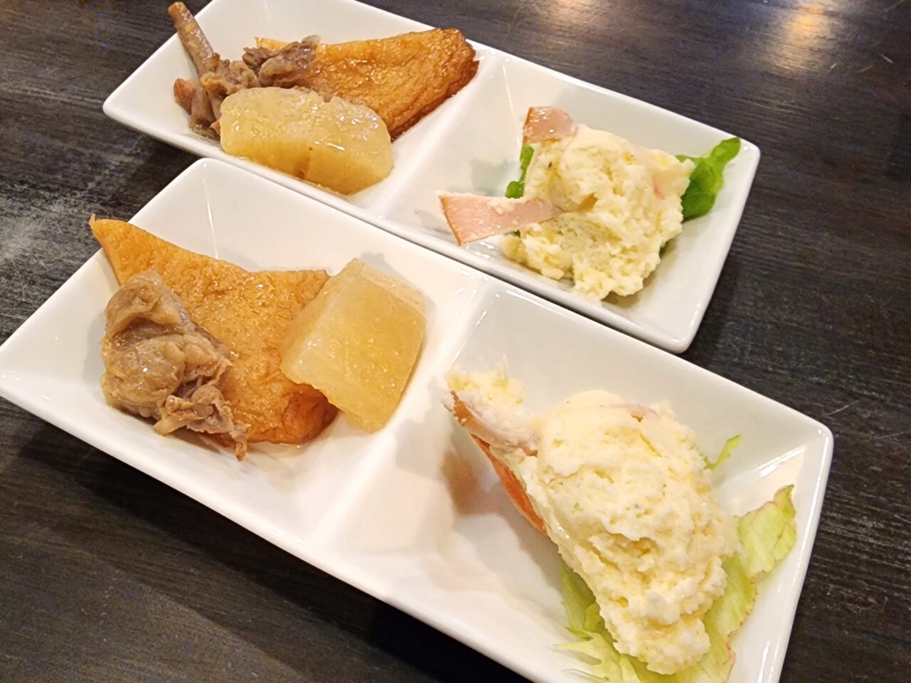 取材時は、味がしみしみの煮物とポテトサラダのお通しでした。