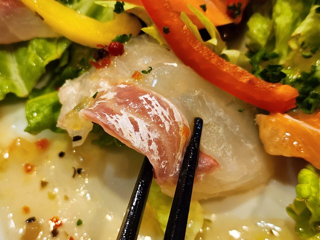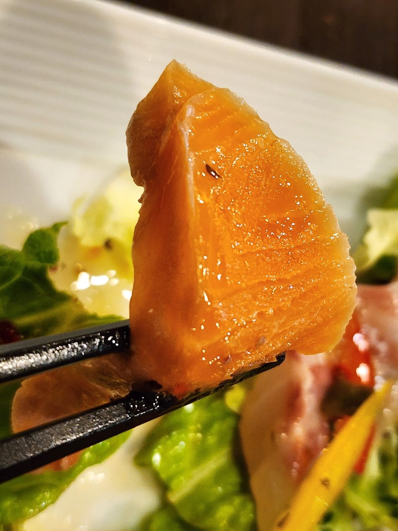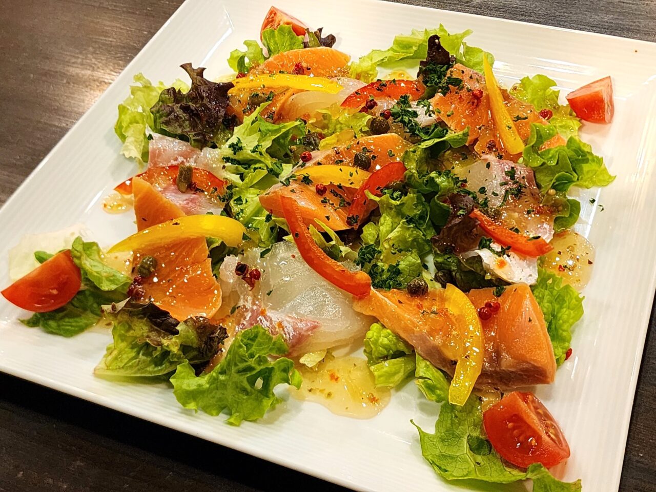 「サーモンと白身魚のカルパッチョ」は、「白身魚」も「サーモンも肉厚で新鮮。どちらもおいしかったですし、野菜もシャキシャキでドレッシングとの相性も抜群でした。