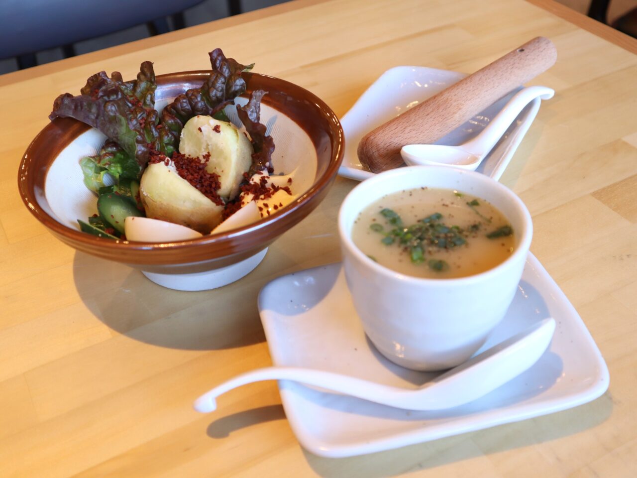 「すり鉢半熟卵のポテサラ」は自分で潰すのが楽しく、グループ飲みや子どもとの食事でも盛り上がりそうな印象でカリカリベーコンの食感も楽しめる1品でした。