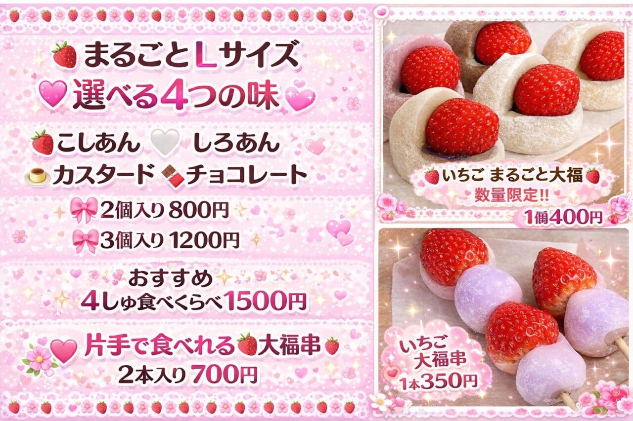 販売予定商品:いちご大福、みたらし団子など