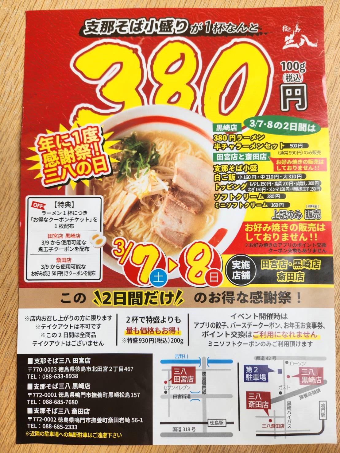 【徳島市&徳島県鳴門市】見逃し厳禁の緊急朗報!徳島ラーメン支那そば「三八」の支那そば小盛り1杯が税込380円♪今週末3月7日・8日の2日間のみ!
