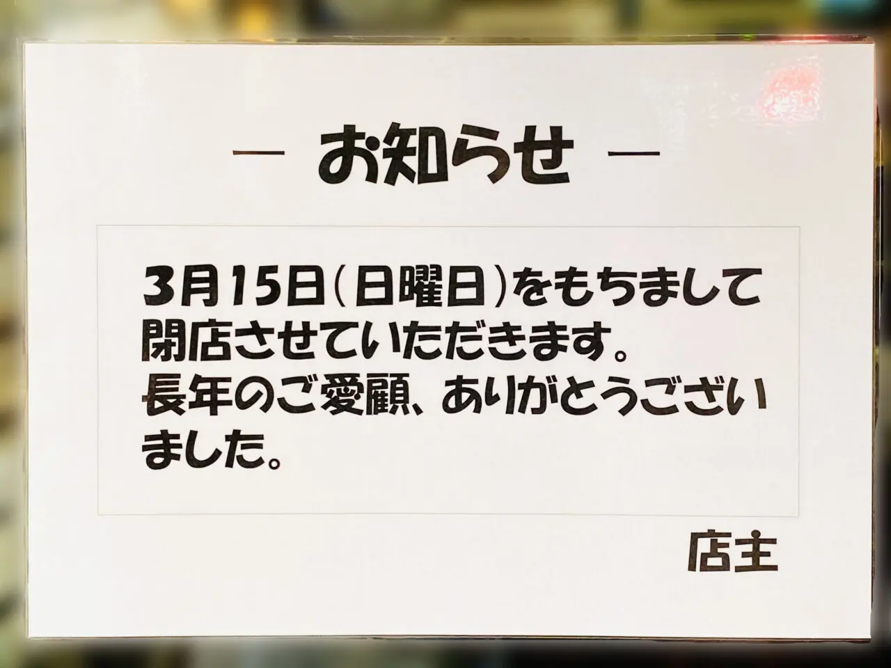 【閉店日】2026年3月15日(日)