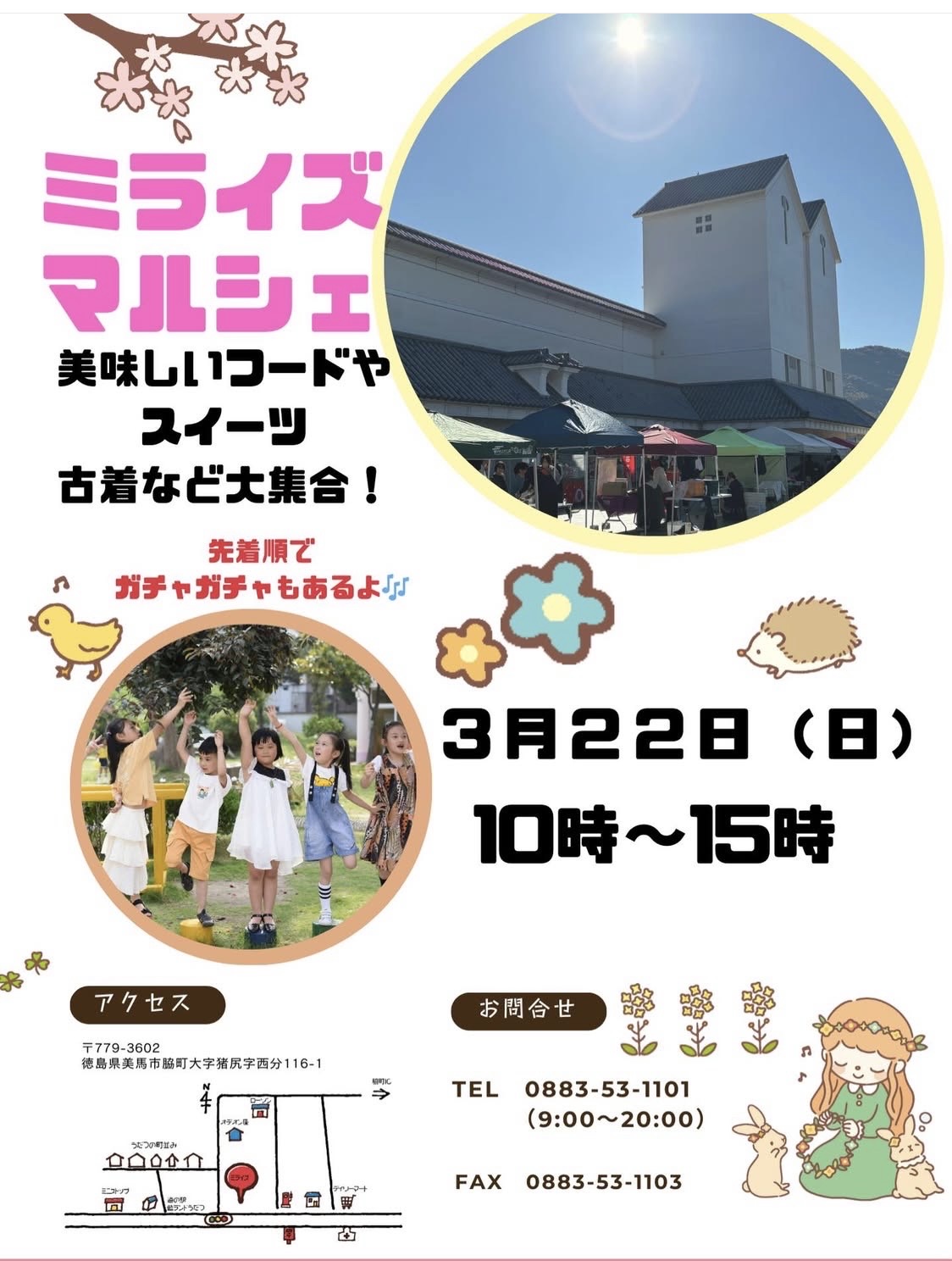 徳島県美馬市脇町にある美馬市地域交流センター「ミライズ」にて本日2026年3月22日(日)10:00~15:00、「ミライズマルシェ」が開催予定となっています。