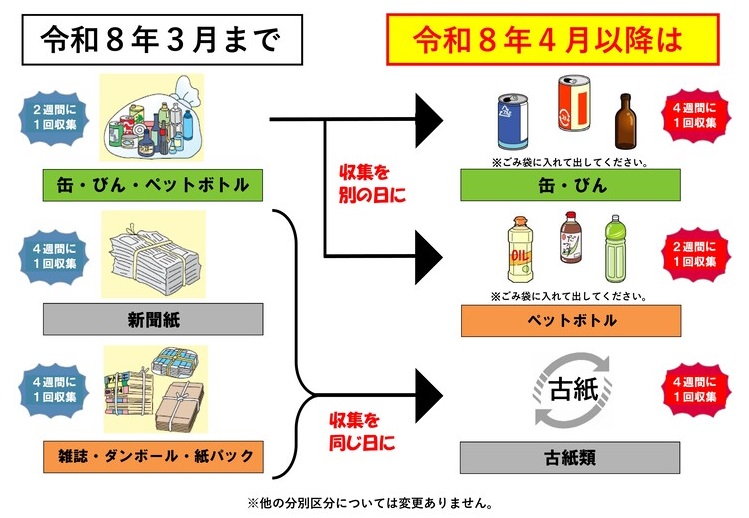 「缶・びん・ペットボトル」→「缶・びん」2種類と「ペットボトル」単体の収集に変更。