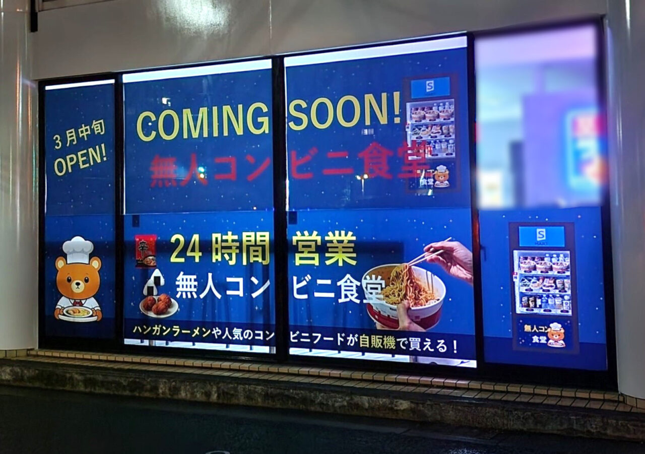 オープン準備をしていた24時間営業「無人コンビニ食堂」店舗外観。画像提供:「にんにくガーリック」様