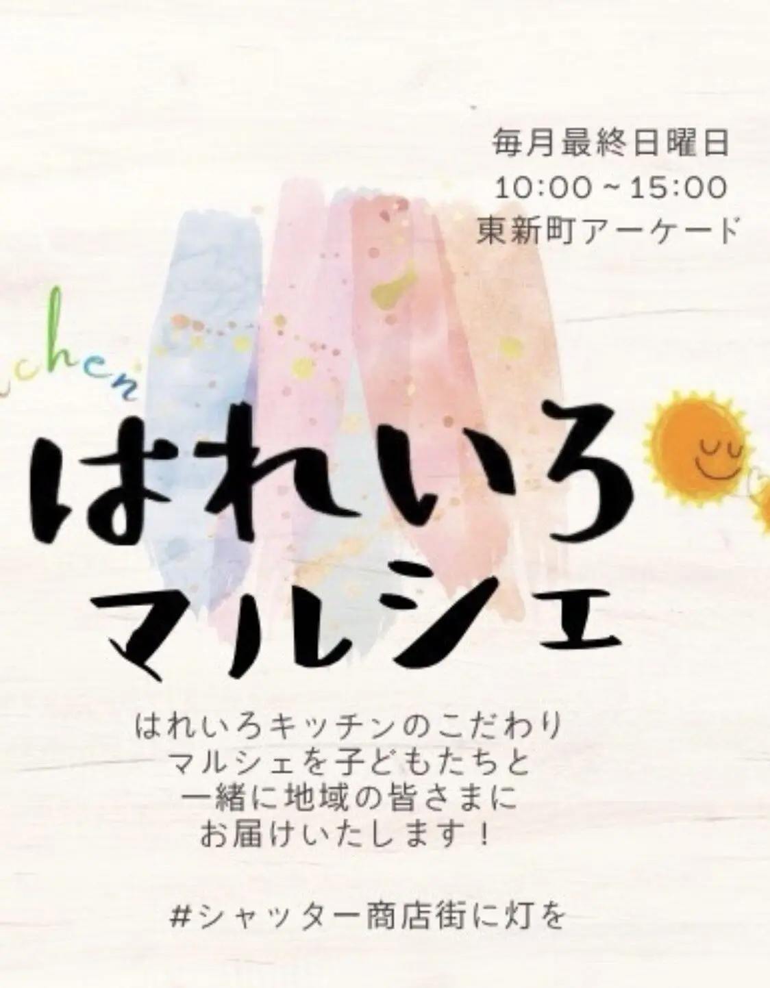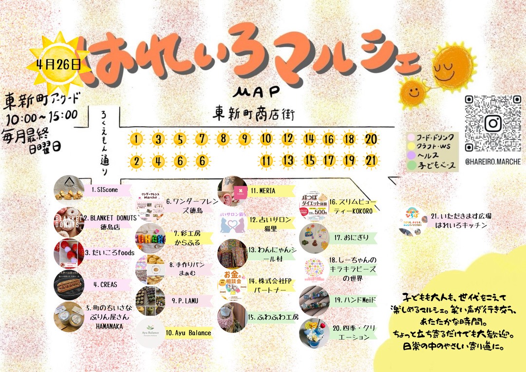 徳島市東新町にある東新町商店街(東新町アーケード内)にて今週末2026年4月26日(日)10:00〜15:00、イベント「はれいろマルシェ」が開催予定となっています。