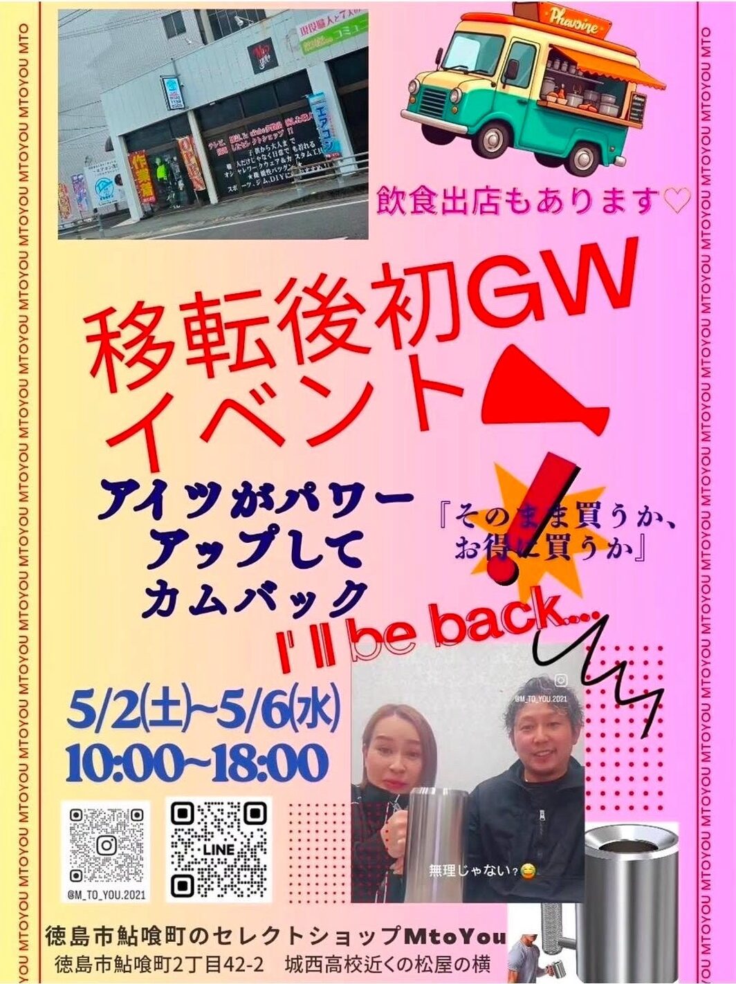 【徳島市】移転後GW初イベント!セレクトショップ「M to You」presents「着て見て集まって食べるイベント」5月2日~6日開催予定♪出店ブースもあり